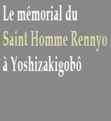 Rennyo (1415-1499), huitieme maitre de l'enseignement du temple Honganji, est venere par les diciples de Jodo shinshu comme le veritable fondateur de la secte dans la mesure ou c'est sous son impulsion que celle-ci a restaure son unite doctrinale et renforce la cohesion communautaire. C'est la le fondement qui a permis a la secte de se developper a travers le pays pour devenir ce qu'elle est aujourd'hui, avec plus de 19300 temples au Japon. En 1471, il partit incognito pour la province du Hokuriku et s'installa a Yoshizaki au mois d'aout de la meme annee. Il y fonda un foyer de predication et rencontra un succes sans precedent. Le site abritant jadis le temple de Yoshizaki baptise ≪ Yoshizakigobo ≫ reste encore de nos jours un lieu saint dans l'esprit des adeptes. Ce n'est donc pas par hasard que la Fondation pour la Conservation du temple Honganji a choisi Yoshizaki a Echizen, lieu impregne des souvenirs du grand fondateur de la secte, pour y construire, en 1998, le Memorial du Saint Homme Rennyo a Yoshizakigobo.