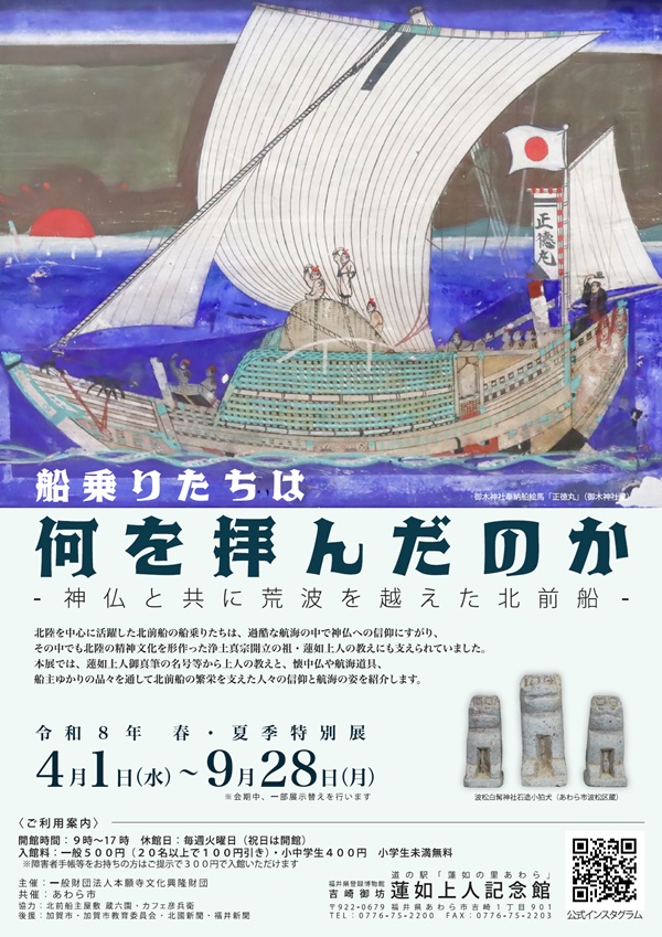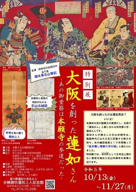 日本で唯一つ、蓮如さんをテーマにしたその貴重な文化財を展示する福井県認定博物館。 蓮如さん真筆の名号(みょうごう・南無阿弥陀仏)の掛軸の所蔵は日本一です。