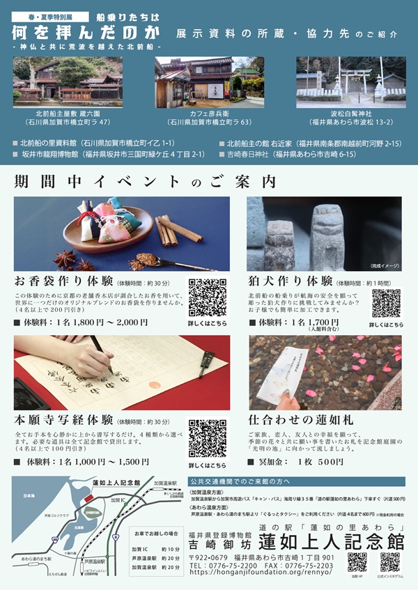 蓮如さんと特別展の魅力をプロガイド・語り部がマンツーマンで解説します。500年の悠久の歴史と文化を体感する吉崎御坊跡、鹿島の森等の吉崎歴史周遊ウォーキングもあります(別途料金、要問合せ)