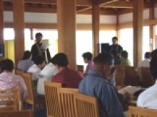 日時:平成22年9月4日(土) 講師:本願寺堂役大谷浩文師 今回は正信偈を中心に教わりました。正信偈には九種類の読み方があり、その中でも、本山のお朝事の際、お勤まりになる「中拍子」(ちゅうびょうし)を習い、皆さんで唱和しました。 読み方の注意点や、音の上げ下げ、節譜の読み方など丁寧に解説して頂きました。皆さん、熱心に練習され、最後には、先生からのお褒めの言葉も頂きました。